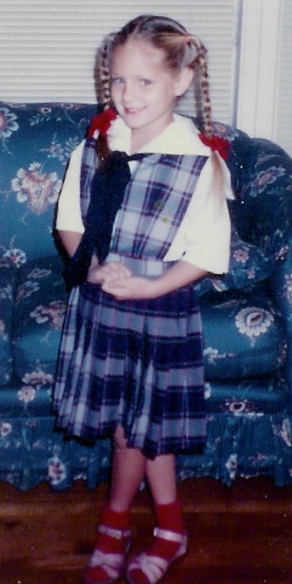 Posing, Gretyl-style, on my first day of first grade. My favorite part of this is the pink salt-water sandals. I think I convinced my mom that they matched my uniform because “red and white makes pink, mom!”