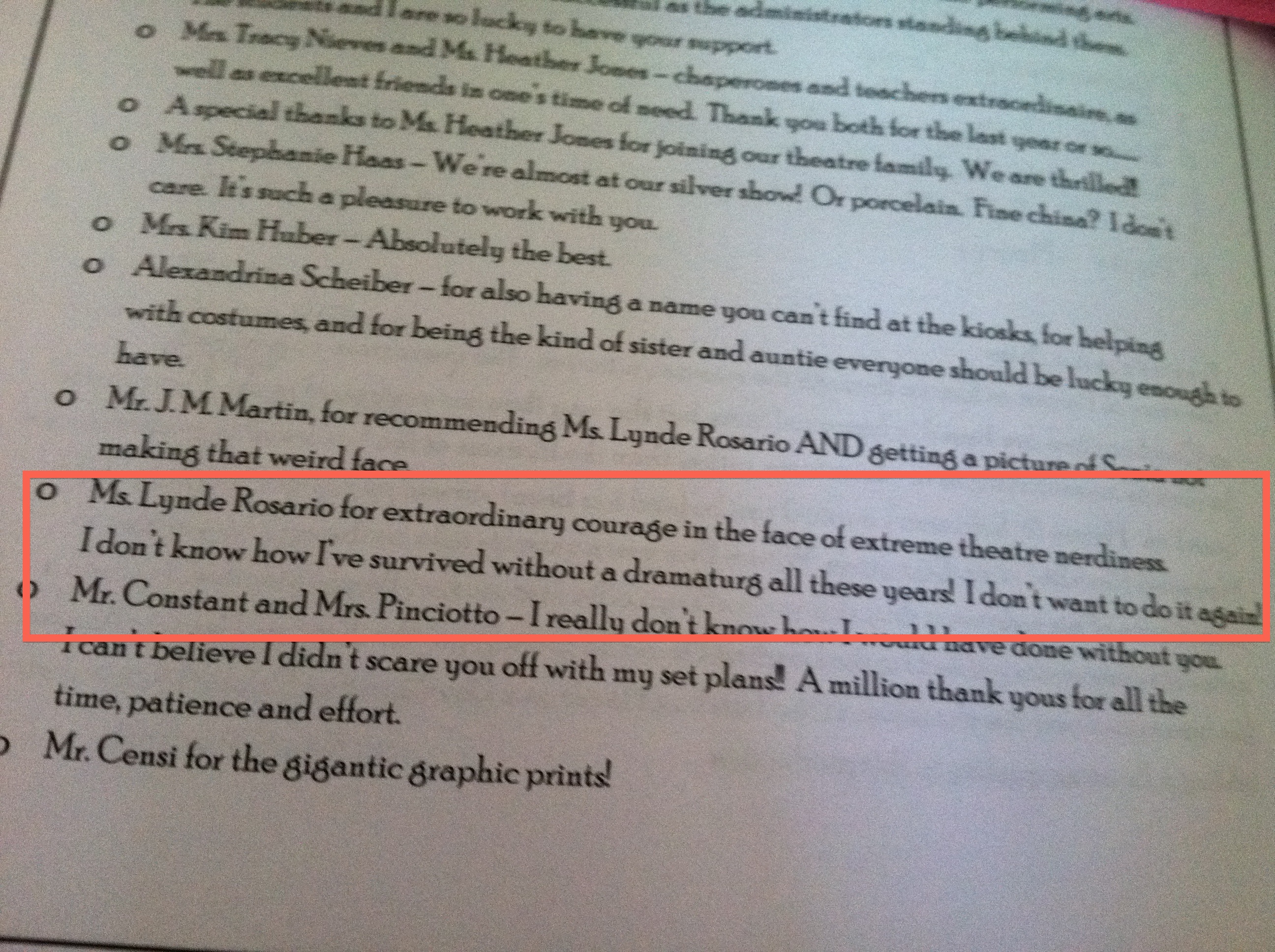 This is wonderful! Not only are you getting paid to work on theatre, you are shaping young lives and helping provide theatre and all its trappings as a part of the foundation of who these people will become–regardless of whether or not they choose theatre as a profession. My family and friends have influenced my lives to a large degree, but I still feel like the people who really made me look at myself and forced me to grow were my teachers. And to them I will always be indebted and grateful. I’m sure some of your students will be, too!