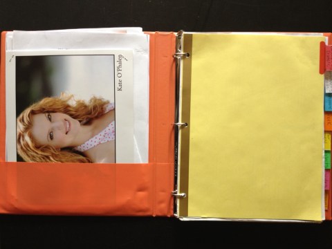 Headshots, printed out sides, and other recent paperwork in the pocket on the left, monologues and prepared sides organized in excruciating detail on the right.