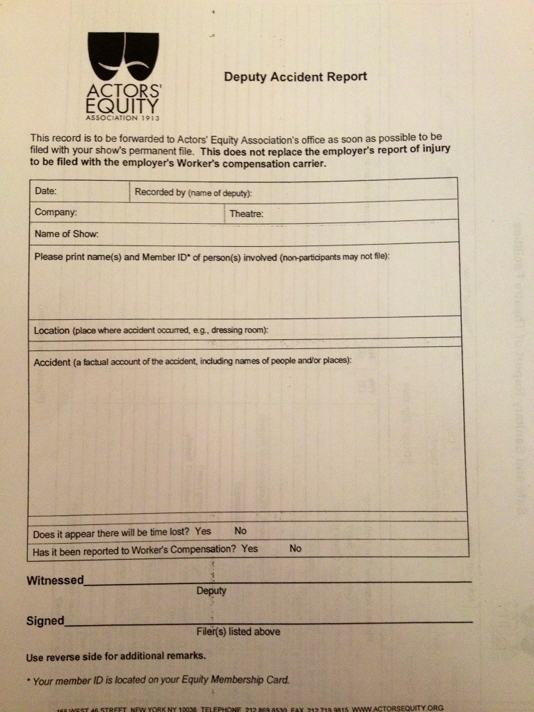If there are any physical accidents during a rehearsal or performance, you’ll need to fill this form out, on behalf of your injured cast mate. I haven’t had to fill one of these out yet, but I did have to have one filled out on my behalf when I got shin splints jumping off a high countertop: