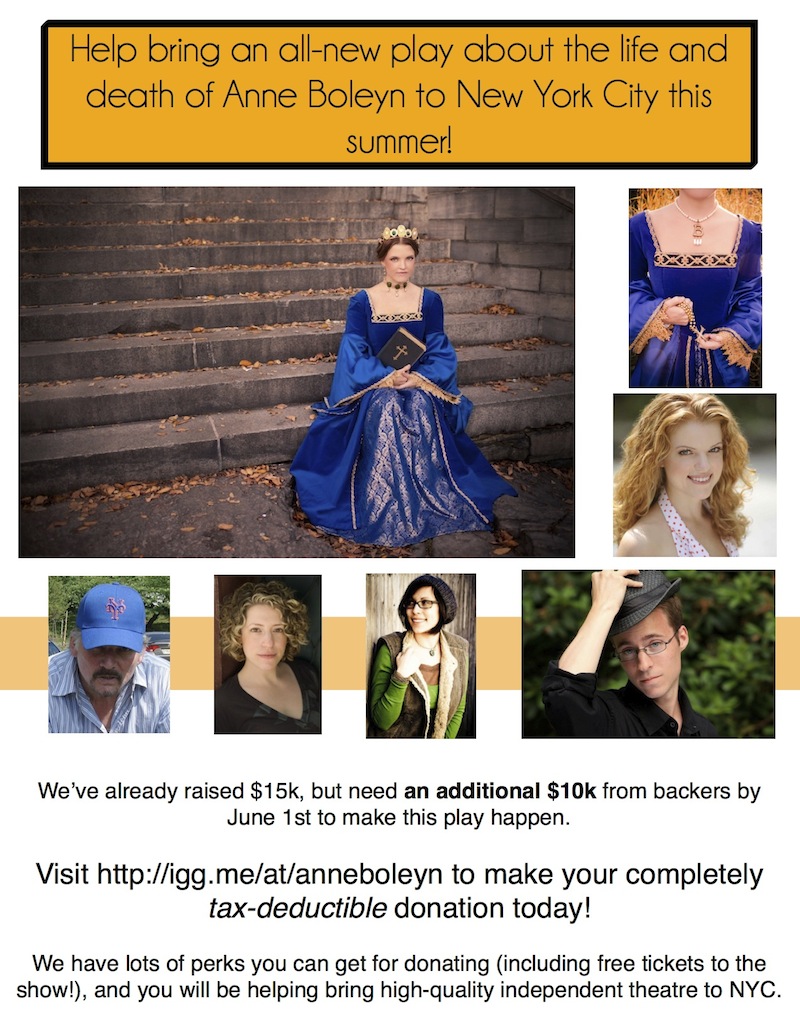 First, I thought about dipping my toes into the producing world, but worried about the money. Then, I decided to go for it and a playwright friend wrote an original Anne Boleyn play for me to star in. I got the social media going, organized a promotional photo shoot, and started the ball really rolling. I started fundraising from private donors (and raised almost $15k!), booked the space, and hired a seriously exciting Off-Broadway director.
